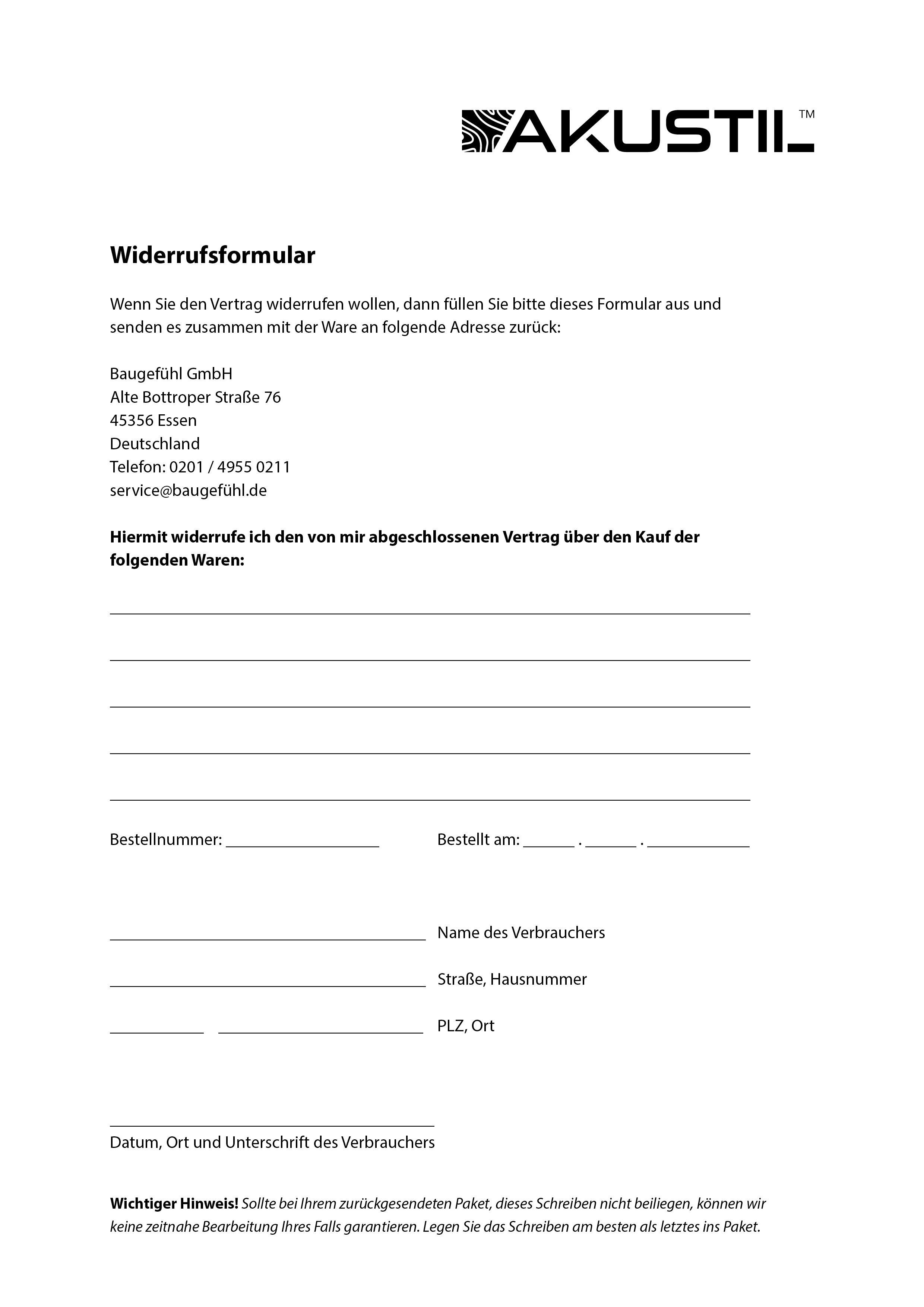 5.3 Um das Widerrufsrecht auszuüben, müssen Sie uns, der Baugefühl GmbH, Alte Bottroper Straße 76, 45356 Essen, Deutschland, mittels einer eindeutigen Erklärung (z. B. ein mit der Post versandter Brief oder eine E-Mail an service@baugefühl.de) über Ihren Entschluss, diesen Vertrag zu widerrufen, informieren. Ein vorgefertigtes Widerrufsformular steht Ihnen unten als Download zur Verfügung.